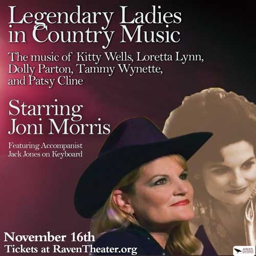 Award winning vocalist, song writer, and entertainer Joni Morris performs her Legendary Ladies in Country Music: Kitty Wells, Loretta Lynn, Dolly Parton, Tammy Wynn, and Patsy Cline. You may have seen Joni’s tribute to the music of Patsy Cline at the Raven in 2024; this show is equally spectacular, with beautiful costumes, charming audience interaction, and comedy, too! Joni’s Legendary Ladies is a must-see for any country music fan!